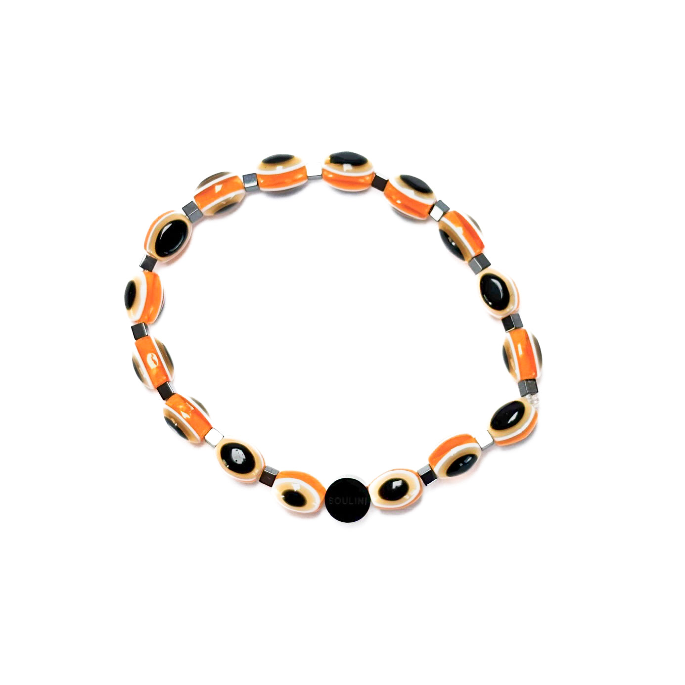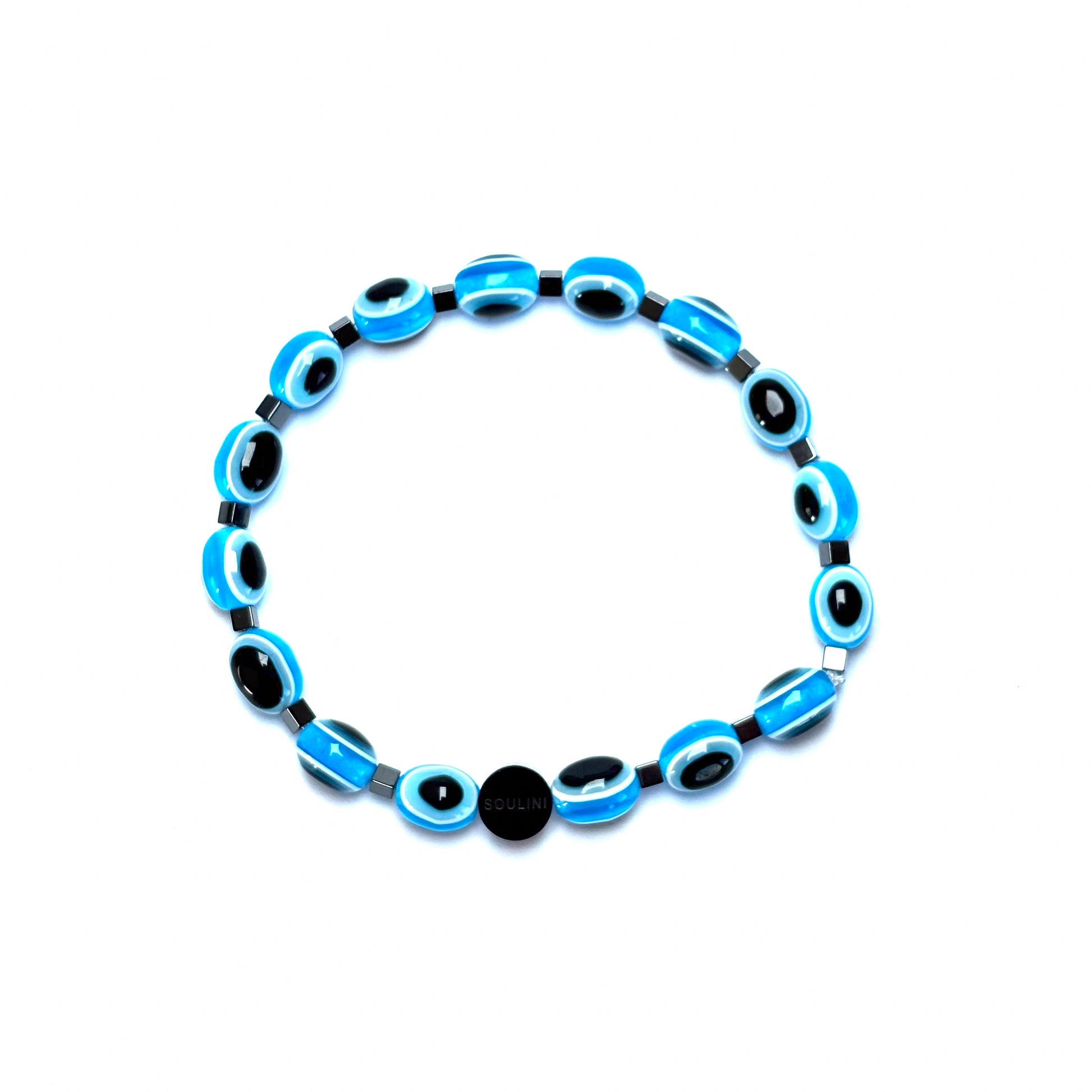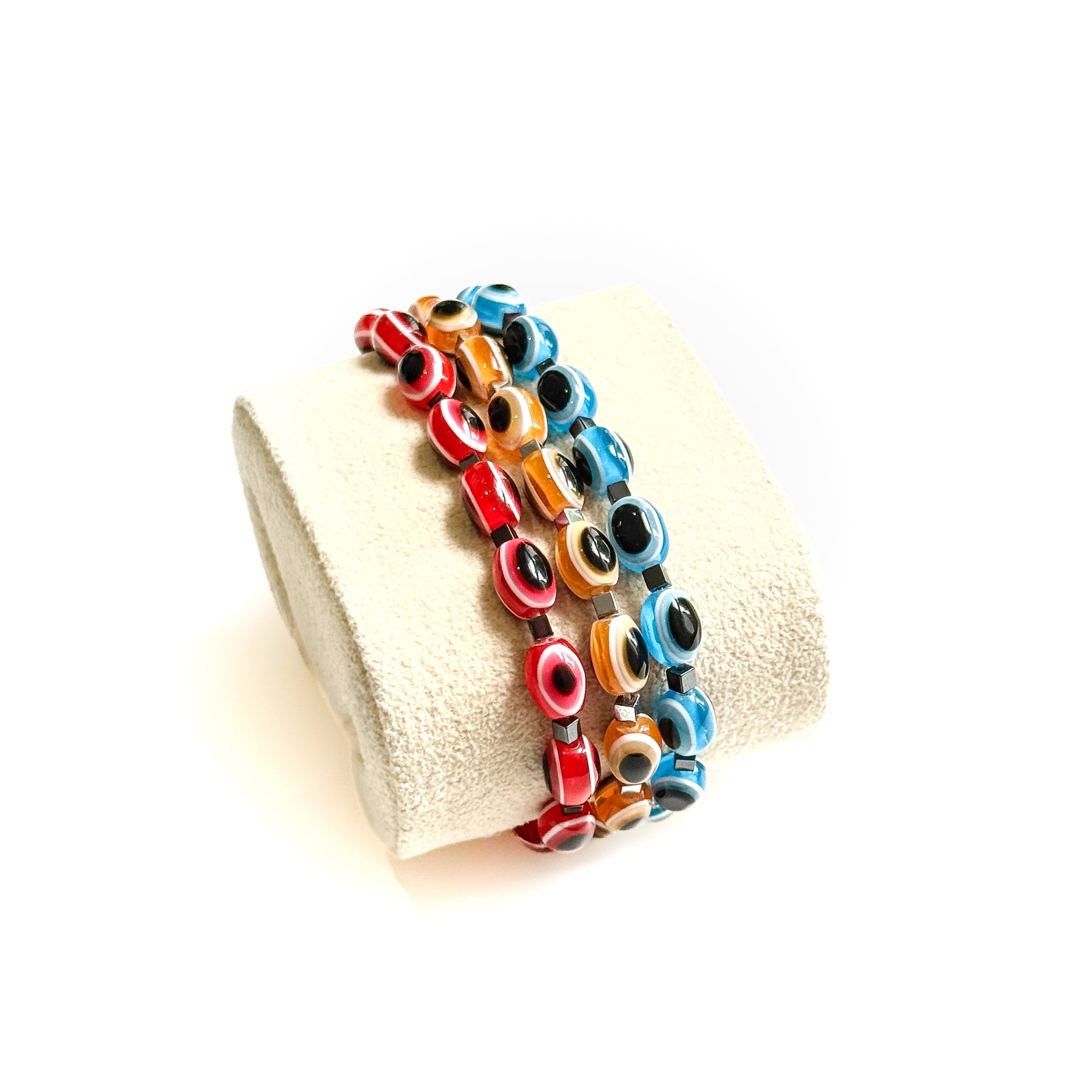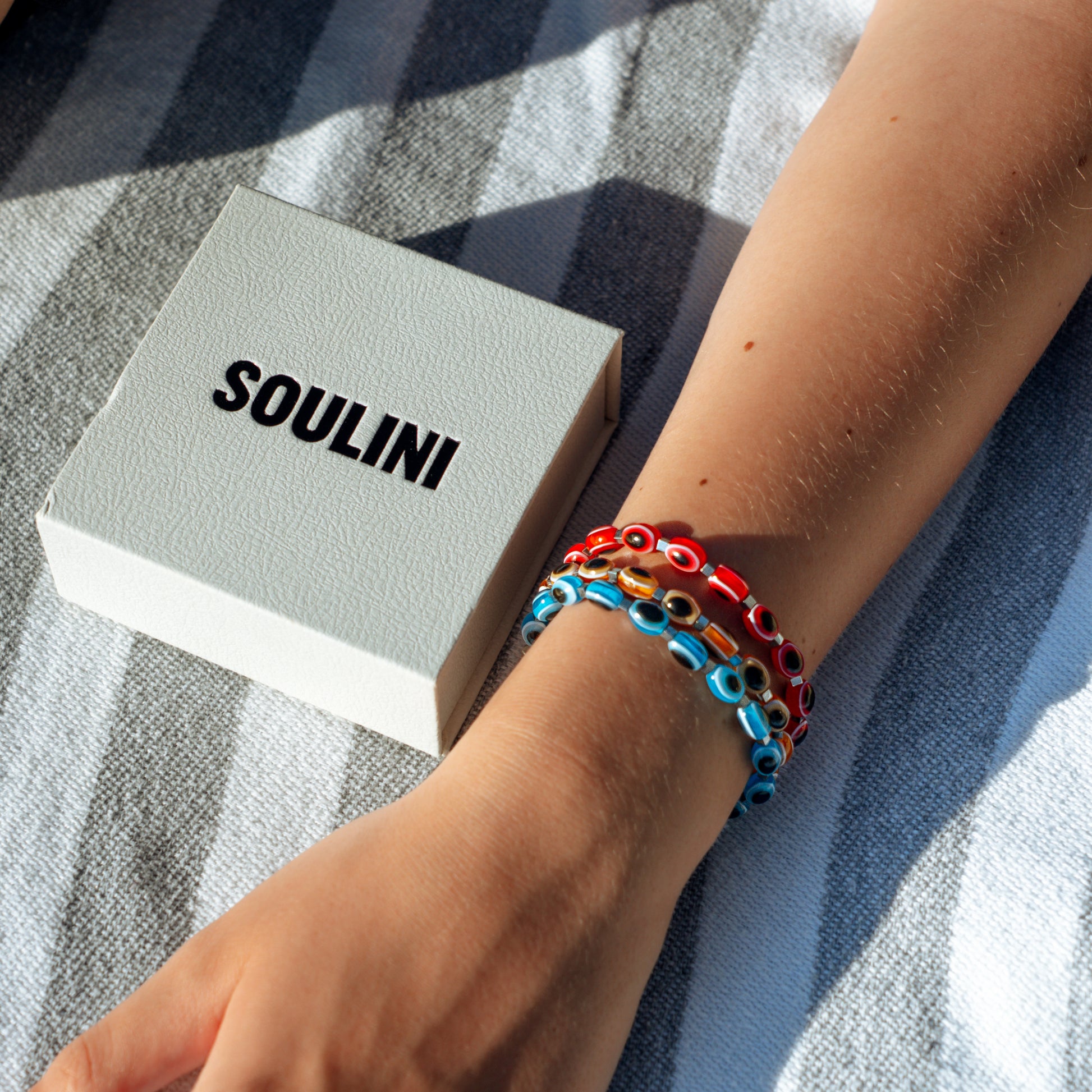 The colors of Saint Tropez Set includes three Soulini Bracelets in red, bold orange, and pastel blue, each featuring the iconic evil eye design symbolizing protection and positive energy. Inspired by Mediterranean tradition, the evil eye is believed to repel negativity and attract good fortune. All bracelets are crafted from high-quality materials on durable elastic bands for effortless and comfortable wear.
